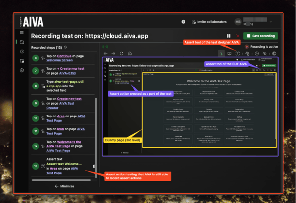 In the SUT AIVA, click “Create new test”. At this point, we have a test recording running inside a test recording. We must be careful to make sure we use tools at the correct level. Since we want to test the assert function, we must use the assert tool in the SUT AIVA. Then, to confirm the result, we use the assert tool of the test designer AIVA.