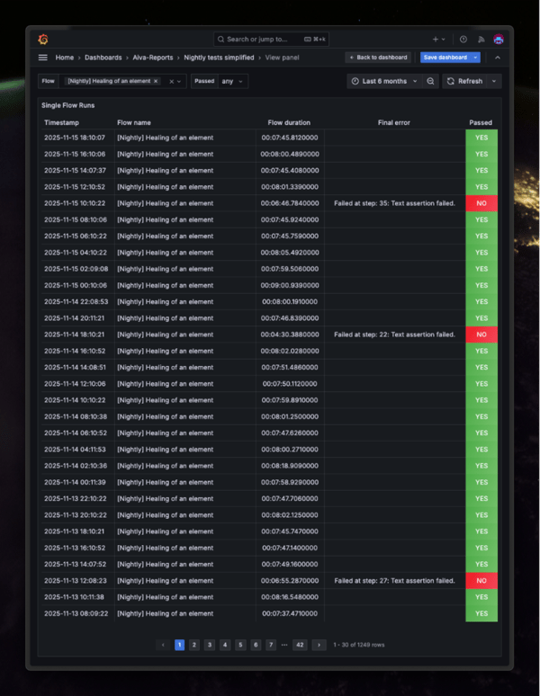 For instance, the screenshot below shows results from an automated AIVA test run by AIVA itself. The results are shown in Grafana. Most test executions pass, as is often the case with manual testing, but occasional failures reveal hidden problems. Upon investigation, we uncovered a race condition: the healing of an element was sometimes affected by other tests running simultaneously.